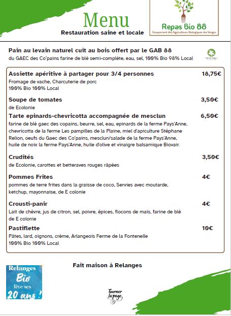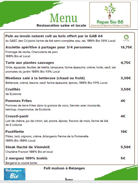 Un « Repas Bio 88 » est organisé dans le cadre de la fête Relanges Bio du 18 et 19 avril 2026