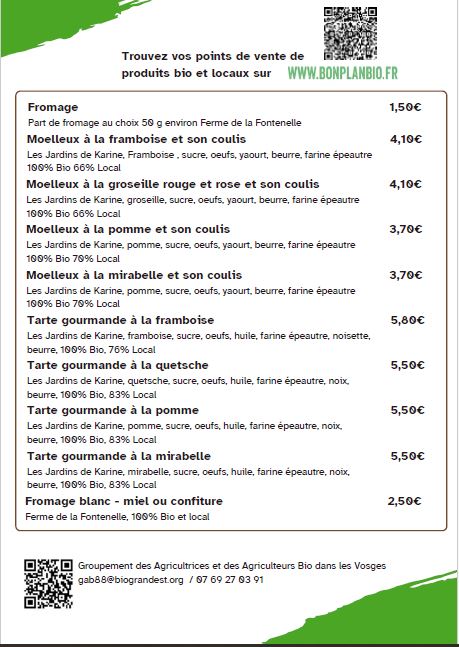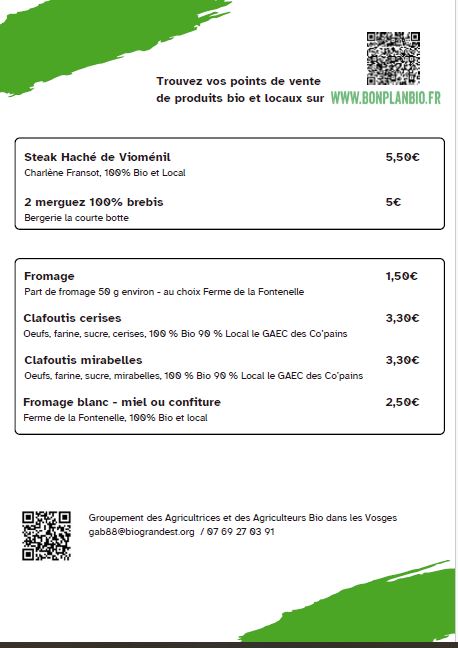 « REPAS BIO 88 » est une initiative portée par le GAB des Vosges, en partenariat avec la Chambre d’Agriculture des Vosges et le Conseil Général, dans le cadre de la plate forme EEDD (Education à l’Environnement et au Développement Durable) du Conseil Départemental. L’objectif est de développer des outils permettant la mise en relation des producteurs avec les organisateurs d’événements (bals, fêtes locales, etc.) pour que ces derniers puissent proposer des « Repas Bio 88 » servis par les producteurs locaux lors de leurs manifestations.